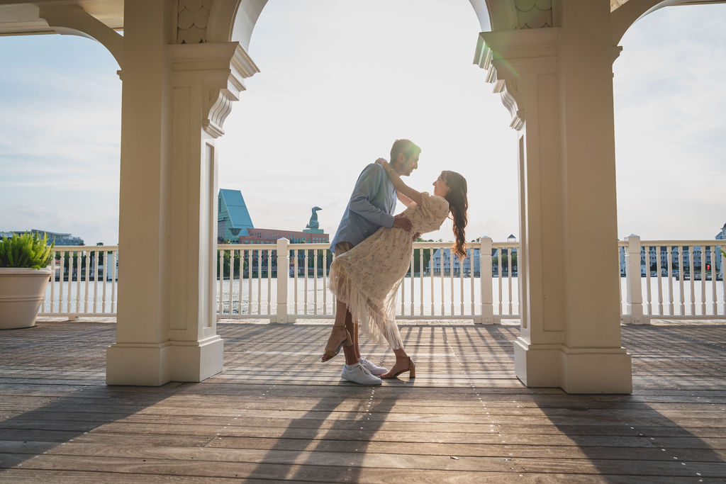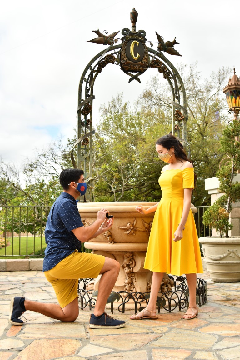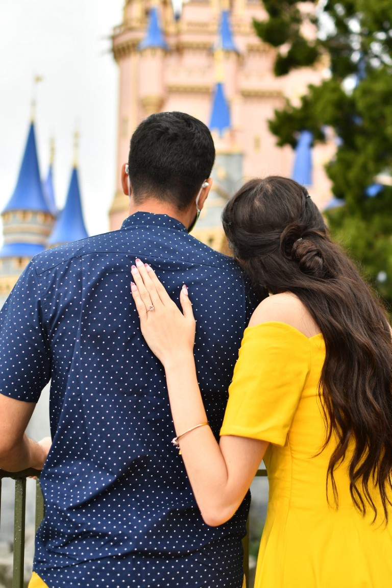 So here it is, the fairytale from yours truly. Eric and I had always planned to celebrate our year anniversary at Magic Kingdom ( where else? 🤣). I thought we would just be enjoying a day at the park with lunch reservations at Be Our Guest ( hence the Disneybound). Meanwhile, my best friend and Eric crafted the perfect proposal. Jessica Wilson created a surprise scavenger hunt that sent us ALL over the park. Every clue was related to a memory of our relationship, I mean we spend A LOT of time in the parks. This scavenger hunt kept me busy until it was time for my second surprise. Eric had book a “Capture the Moment” photo session with Disney PhotoPass Service. Me, thinking, he knows I love photos and what a great day to take them in such cute outfits. Our photographers, Brie and Luis, were wonderful and led us to several locations, taking the most gorgeous photos.